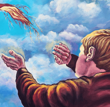 Located at the busy intersection of High and Fayette Streets in downtown Morgantown, Golden Wind shows a vibrant gathering of people following their creative passions. They are all touched by a yellow-orange ribbon that weaves through Morgantown with its rolling hills and buildings. The hot air balloons reference the annual hot air balloon festival in town.