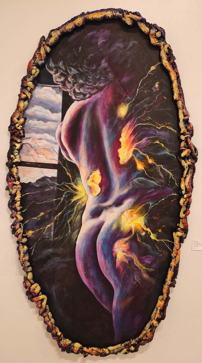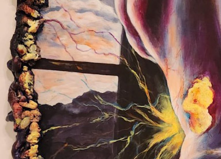 My recent paintings feature bold colors and strong contrasts to show life, space, and energy inside physical bodies. The work reveals vibrant spaces beyond the surface of the skin to show the vitality and connection that exists deeper inside us. Unseen sources of light pervade the internal areas of the body, alluding to an expanse of space and bioluminscence that suggests a larger, potentially healing perspective in the midst of carnal pain.