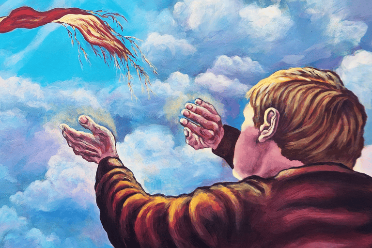 The figures on the left are made with both glass mosaic tiles and paint. The hand on the left holds a plexiglass mirror that suggests everyone can see themselves reflected in the mural, and are part of the vision and mission. Isaiah 58:10-12 winds through the sky, guiding the figures in the mural as it inspires the mission of Eastminster.