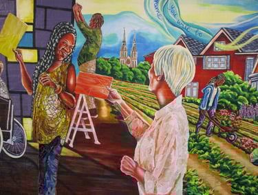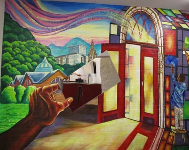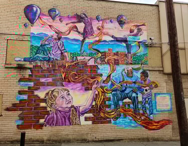 A warm and colorful 13 x 80 ft. image of togetherness, history, and co-working now greets everyone who comes near to the GATEWAY Center along U.S. Rt. 60 in Smithers, WV. Titled Building Our Future Together, the mural features brightly-colored building blocks with words of inspiration coming from people in our history. The diverse group of figures on the right side receive those building blocks and build a beautiful new structure with them together. The mural was completed with help from Carly Racer's elementary art students and a group of about 15 adult volunteers.