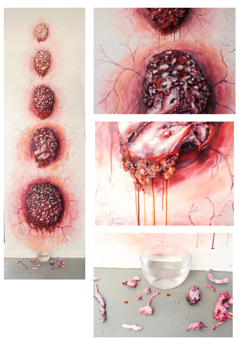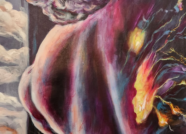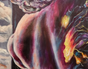 My recent paintings feature bold colors and strong contrasts to show life, space, and energy inside physical bodies. The work reveals vibrant spaces beyond the surface of the skin to show the vitality and connection that exists deeper inside us. Unseen sources of light pervade the internal areas of the body, alluding to an expanse of space and bioluminscence that suggests a larger, potentially healing perspective in the midst of carnal pain.