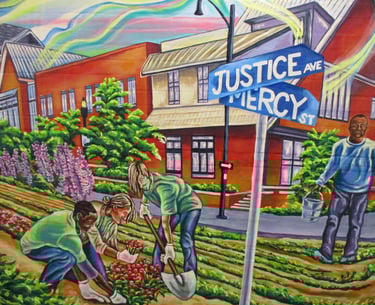 The figures on the left are made with both glass mosaic tiles and paint. The hand on the left holds a plexiglass mirror that suggests everyone can see themselves reflected in the mural, and are part of the vision and mission. Isaiah 58:10-12 winds through the sky, guiding the figures in the mural as it inspires the mission of Eastminster.