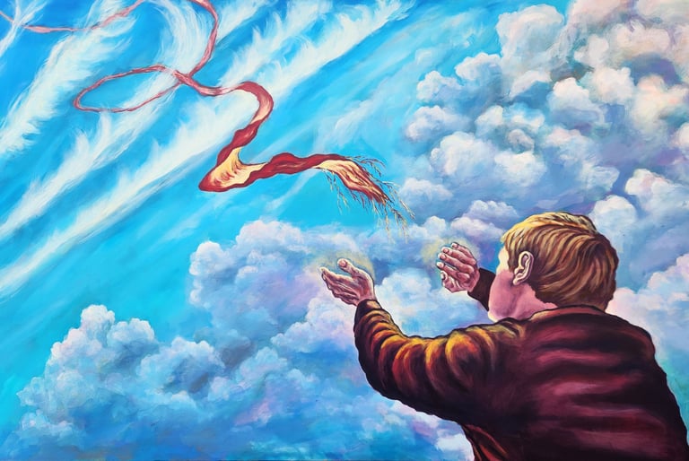 Located at the busy intersection of High and Fayette Streets in downtown Morgantown, Golden Wind shows a vibrant gathering of people following their creative passions. They are all touched by a yellow-orange ribbon that weaves through Morgantown with its rolling hills and buildings. The hot air balloons reference the annual hot air balloon festival in town.